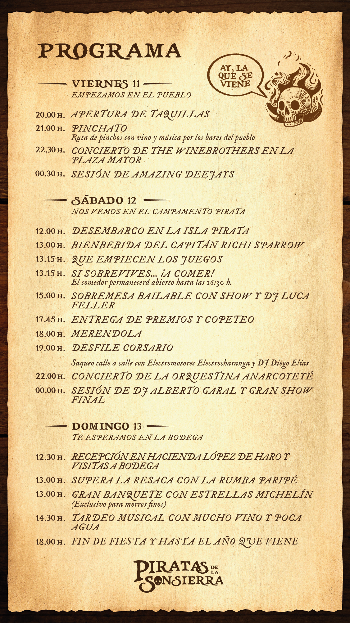 Este octubre los Piratas de la Sonsierra desembarcan en San Vicente de la mano del Capitán Wine Sparrow y sus secuaces dispuestos a poner el pueblo patas arriba en busca de la barrica del tesoro. Surcando el mar de viñedos riojano le acompañarán el temible Barbatinta, Lord Nelson, Francis Drake, Hook y resto de infames corsarios. Solo nos faltas tú, pirata. Únete al abordaje y ven a saquear nuestra bodega.
